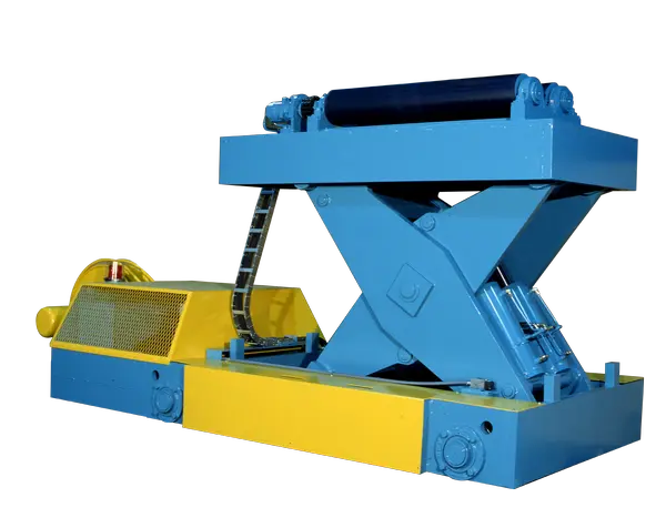 The Opposed Cylinder Style Coil Car is designed for large, heavy coil handling in process lines, mills and other high-duty applications. The opposed cylinder design has cylinders pushing up on one side of the scissors center pivot and pushing down on the other. This allows for maximum capacity and minimum pivot.