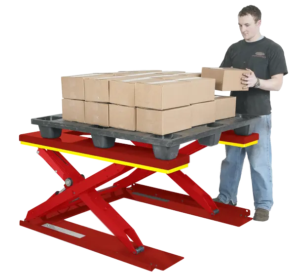 The Roll-In Level Loader features a unique low-profile design that allows it to be fed with an ordinary hand pallet truck. The pallet moves over the Roll-In while the pallet truck rolls between the outside platform and the center support beam.